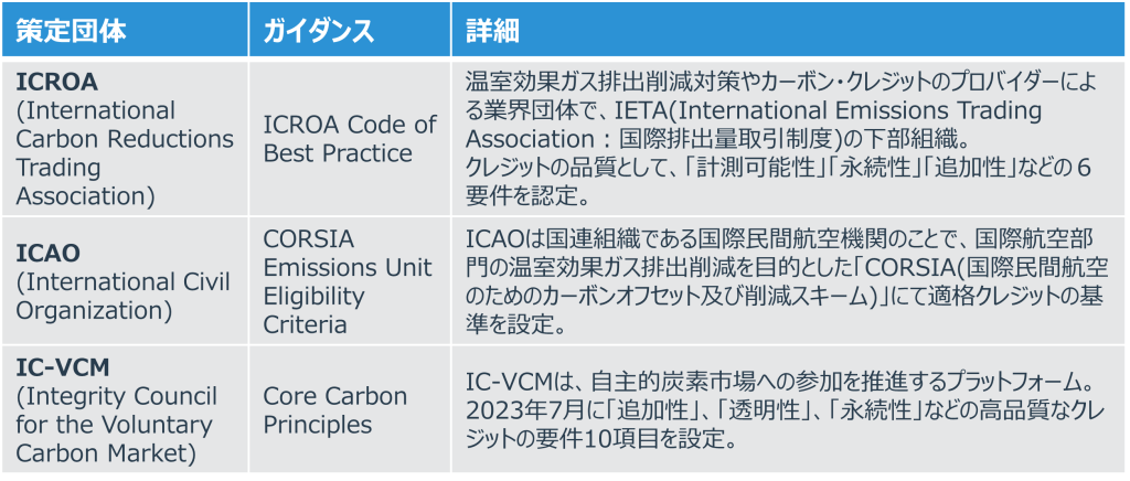 こうしたリスクを回避するために、高品質なクレジットには要件が設けられており、それらを満たすことでリスクを抑えることができます。クレジットの品質基準を定めている主な団体は以下のとおりです。