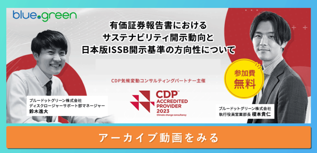 弊社では2023年10月に、有価証券報告書におけるサステナビリティ開示動向と日本版ISSB開示基準の方向性に関するウェビナーを開催。「ISSBについて動画で学びたい」という方は、“アーカイブ動画をみる”ボタンから申し込みページにお進みください。